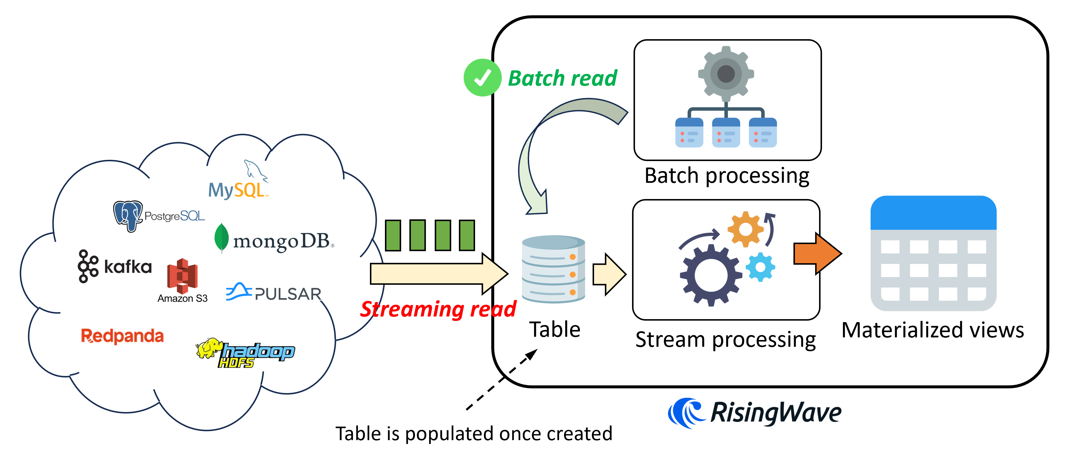 source上创建物化视图或者sink时,才会从source里开始读取数据; - RisingWave 的批处理引擎在 1.3 版本(及之前)仅支持从 Kafka 中批量读取
